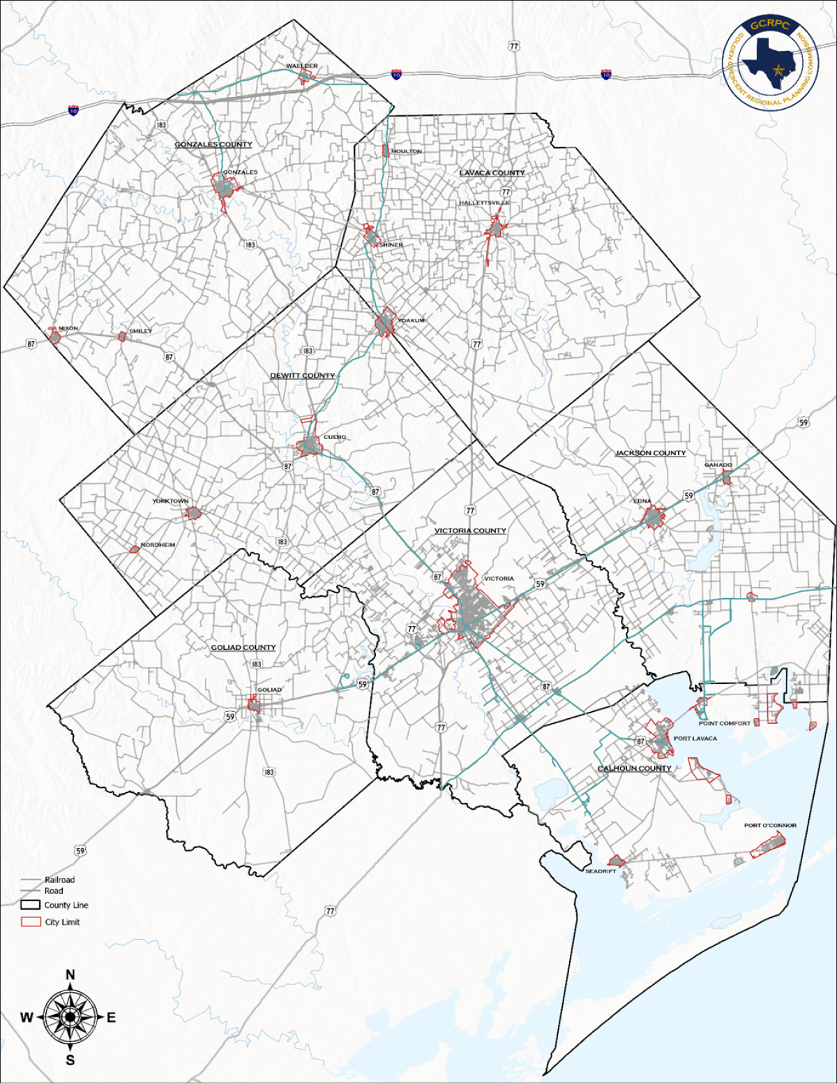 Formed in 1968, The Golden Crescent Regional Planning Commission (GCRPC) is a voluntary association of local governments and special districts within the seven-county Golden Crescent region encompassing Calhoun, DeWitt, Goliad, Gonzales, Jackson, Lavaca, and Victoria counties.