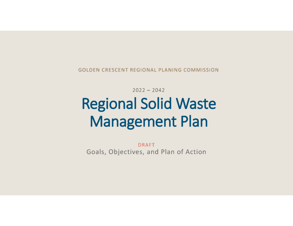 GCRPC is the state designated planning agency for solid waste management issues in the region. The Solid Waste Program reviews applications for landfill permits and solid waste grants. Each year GCRPC provides oversights on Texas Commission on Environmental Quality (TCEQ) funding for local government projects, including source reduction, recycling, local illegal dumping enforcement, solid waste studies, household hazardous waste collections, and public education efforts. GCRPC provides technical assistance to local governments on solid waste issues and continuing education opportunities for local governments and solid waste professionals.