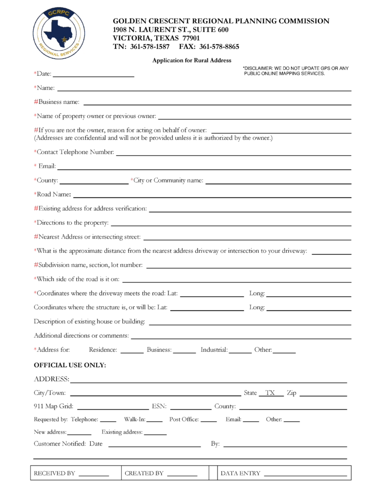 To obtain your 9-1-1 rural address fill out the “9-1-1 Rural Address Application” below and email it to addressing@gcrpc.org, or call 361-578-1587, Option 3 for more information.